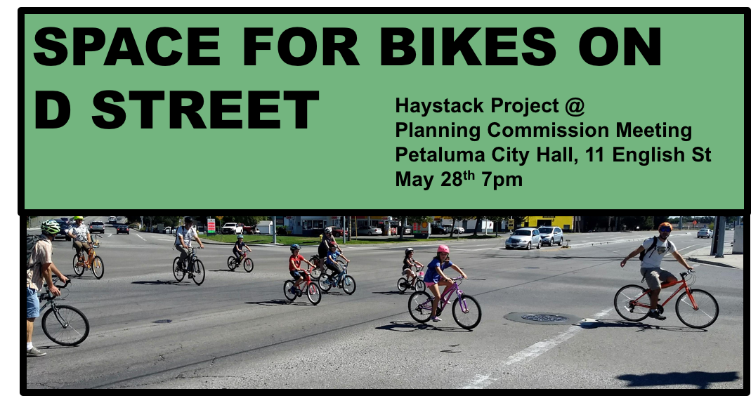 Join us to speak up for space for bikes on D Street at the Planning Commission meeting where the Haystack Development Project will be considered on May 28th, 7pm at Petaluma City Hall. If you are concerned about how space for bikes is being considered along D Street between Lakeville and First St., join us at the planning commission meeting to listen. Consider giving public comment about your experience riding your bike along D street, and the need for comprehensive planning for bikes in this area. The Planning Commission will consider the proposed Haystack development project just east of the Petaluma River, in the space encompassed by D & Washington and Weller & Copeland. Bike Petaluma’s 2019 goal setting included attention to ways to improve the biking experience along D street between Lakeville and First Street. The Haystack Project includes 178 residential units and will be reviewed by the Planning Commission at this meeting.